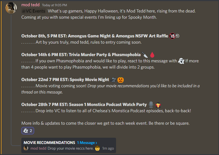 Tedd (the mod of my discord) has planned some fun online events this month. So, if you’re looking for something fun and spooky to do this season, hop on over.