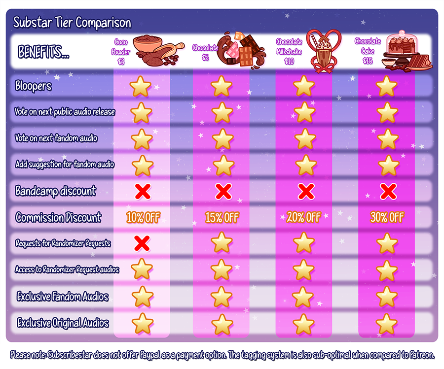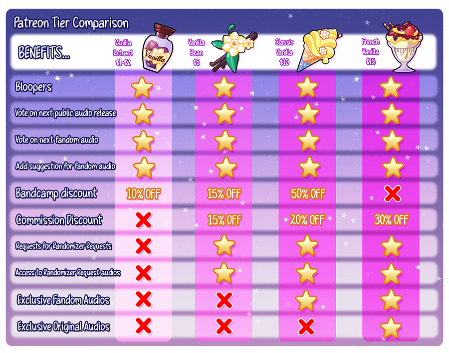 New updates to membership tiers over on my Patreon and Subscribestar. Below is a simplified version of all the benefits